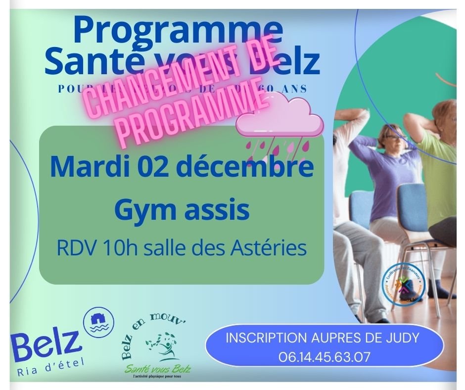 Changement de programme pour la séance de demain! 🌧️ Rdv à 10h en salle des Astéries pour une séance de gym assise 😊 Inscription au 06 14 45 63 07 (Judy)