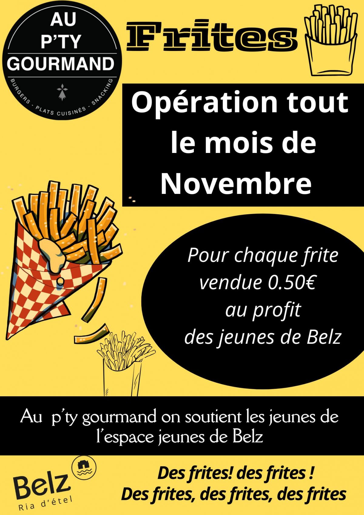 Tout le mois de novembre, chaque portion de frites vendue = 0,50 € reversé à l’Espace Jeunes de Belz. 👍