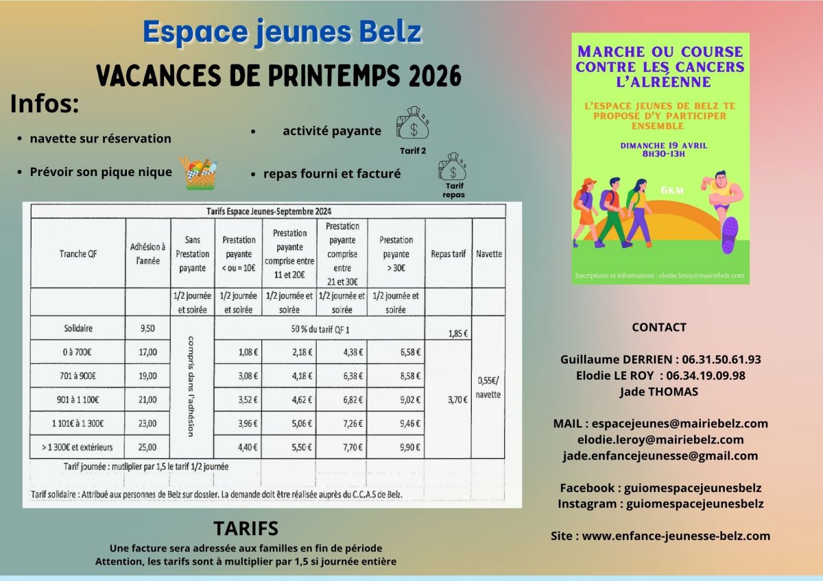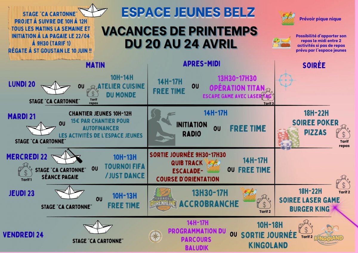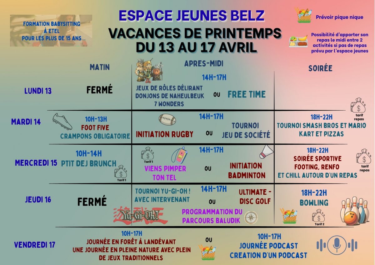 Les vacances d'avril arrivent à grands pas ! Donc à vos agendas pour passer de bons moments à l'espace Jeunes, début des inscriptions dès lundi 30 mars !! A bientôt